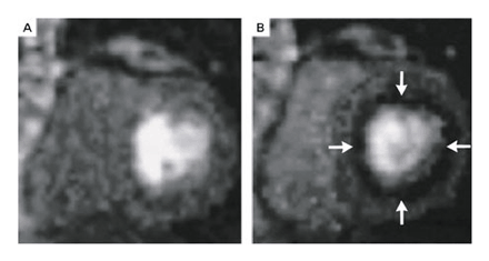 B), Showing Uniform Myocardial Signal Enhancement.
