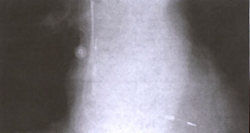the chest x-ray. The ventricular lead is attached to the ventricle by