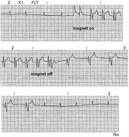Figure 16 k An electrocardiogram of a patient with sinus nodal dysfunction and first-degree atrioventricular block who has an implanted VVI pacemaker. Note that application of a magnet causes VVI pacing in the asynchronous mode at a rate of approximately 95 beats per minute. After the magnet is removed, the pacemaker reverts to VVI at 50 beats per minute until the patient's sinus rhythm inhibits pacemaker function. Mitrani,R.D. and others,Cardiac Pacemakers,Hurst's The Heart,10th edition,Vol.1,pp.963-992 |