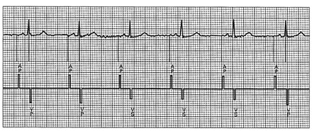 Figure 16 o Surface electrocardiogram with marker channels of a patient with a dual-chamber pacemaker in the DDD mode. Note atrial pacing of aLl complexes. The first, second, and last complexes have paced ventricular outputs in the middle of the QRS complex. Compared to the third, fourth, and fifth complexes, which do not have these ventricular pacing spikes, there is no change in the QRS complex. This is consistent with pseudofusion" of the QRS complex. This is due to the fact that the ventricular depolarization is not sensed by the pacemaker until the middle or end of the QRS complex in this particular patient. Subtle variations in the conducted PR interval account for the fact that some of the complexes have a paced ventricular complex and some do not. Mitrani,R.D. and others,Cardiac Pacemakers,Hurst's The Heart,10th edition,Vol.1,pp.963-992 |