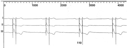 Figure 16 q Surface leads I, II, and III are shown at paper speed of 50 mm/s. Note that there is complete undersensing of the P wave. The pacemaker therefore tends to pace at the Lower rate interval, which corresponds with an intrinsic QRS complex. This QRS complex is sensed within the ventricular safety period, triggering ventricular safety pacing. For this particular pace maker, ventricular safety pacing occurs at 110 ms after atrial pacing in orde to avoid ventricular pacing during the I wave. Mitrani,R.D. and others,Cardiac Pacemakers,Hurst's The Heart,10th edition,Vol.1,pp.963-992 |