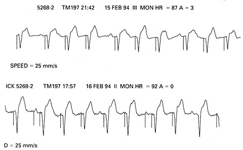 Figure 16 r Top. Sinus tachycardia in a patient with atrioventricular block and a DDD pacemaker with a programmed upper rate of 100 beats per minute, which is less than the intrinsic sinus rate. Note that the interval between the sensed P wave and the paced ventricular complex lengthens progressively, until there is a P wave (within the T wave) following the first, fourth, and seventh paced ventricular complexes without subsequent ventricular pacing, consistent with pacemaker Wenckebach. Bottom. The pacemaker is programmed in the DDDR mode with upper rate of 100 beats per minute. The presence of rate response, during activity, acts to smooth the upper rate, preventing the longer pauses during pacemaker Wenckebach. Mitrani,R.D. and others,Cardiac Pacemakers,Hurst's The Heart,10th edition,Vol.1,pp.963-992 |