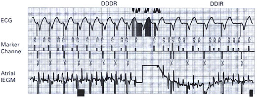 Figure 16 t ELectrocardiogram, marker channels, and intracardiac atrial electrograms (IEGMs) are shown for a patient with atriaL fibriLLation. At the left-hand part of the tracing, there is upper track pacing at an irregular rate due to the atrial fibrillation. Automatic mode switch was programmed on (indicated by the triangles), and the pacemaker automatically mode switched (MS) to the DDIR mode. Note the prolonging of ventricular cycle Lengths after mode switch was activated. Mitrani,R.D. and others,Cardiac Pacemakers,Hurst's The Heart,10th edition,Vol.1,pp.963-992 |
