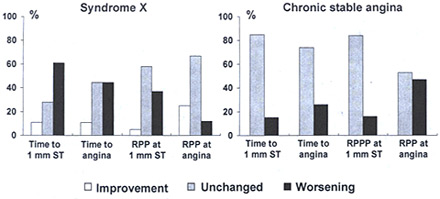 Figure 209-1 Acute effects of nitrates on exercise testing in syndrome X. The administration of isosorbide dinitrate (ISDN, 5 mg sublingual) significantly improved exercise test variables in patients with chronic stable angina and documented coronary artery disease (right panel). In contrast, ISDN caused a worsening of exercise variables in a significant number of patients with syndrome X (left panel). ST, ST segment; RPP, rate pressure product. (Modified from Lanza GA, Manzoli A, Bia E, et aL Acute effects of nitrates on exercise testing in patients with syndrome X: Clinical and pathophysiological implications. Circulation 1994; 90:2695, by permission.) |