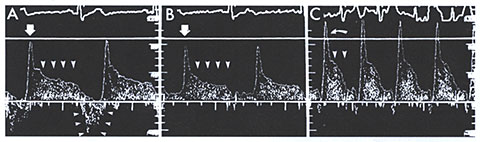 Figure 212-12 Intracoronary Doppler blood flow velocity profile showing the characteristic "finger-tip"-like flow velocity acceleration during early diastole (single arrow) followed by a plateau phase at mid-to-late diastole (arrows in A and B). During systole, there is almost no flow within the bridged segment, but a retrograde flow phenomenon occurs at the entry site of the myocardial bridge (arrows in A). During rapid atrial pacing, absolute diastolic flow velocities are increased, and the duration of the plateau phase is reduced owing to shortened diastole (C). Reproduced from Schwarz et al. (13), with permission. Symptomatic Myocardial Bridges: An Overview.JACC,Vol. 41,No.3,Feb.5.2003,pp.351-359. |