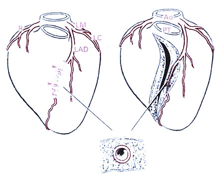 Figure 212-1 (Left) Diagram showing tunneled left anterior descending coronary artery (LAD) (arrowheads). (Right) Opened left ventricle showing intramyocardial segment. (Below) Transverse section of LV wall showing tunneled coronary artery surrounded by myocardium. |