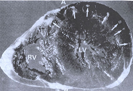 Transverse section of ventricular myocardium showing the "arcade" of tunneled epicardial coronary arteries (arrows). A, anterior LV, left ventricle; RV, right ventricle; P, posterior.